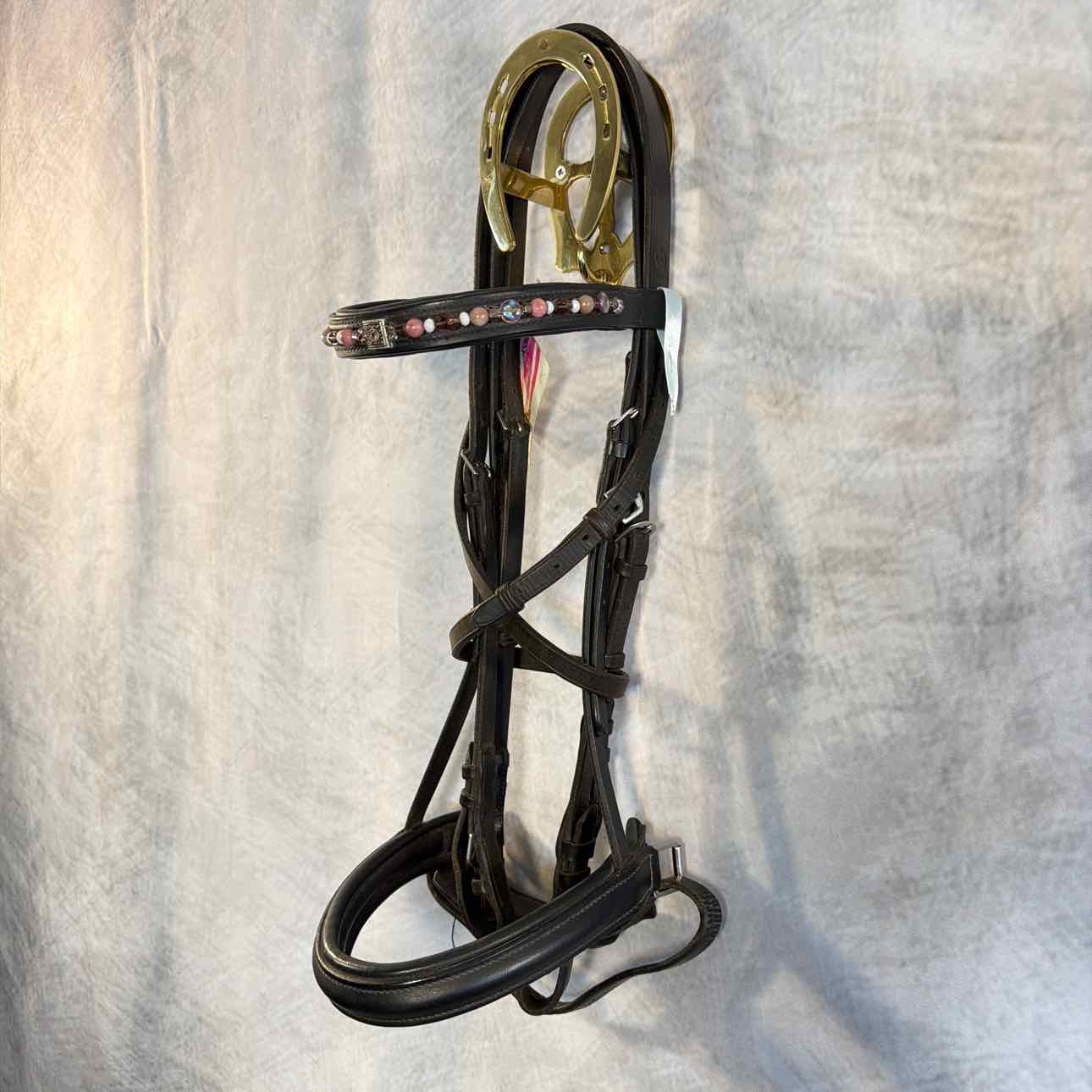 Double Bridle with New Equiart Design Browband ($85.00 New). Raised and Padded Crank Noseband (Edge of Leather Strap has been Cut Off).Used, but Good Schooling Condition. Bit Hangers have Buckle Ends.