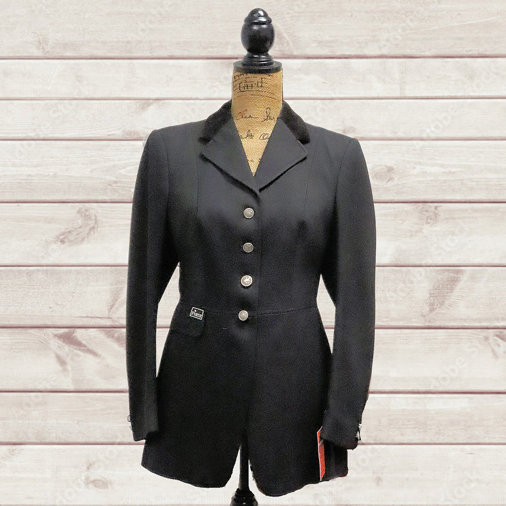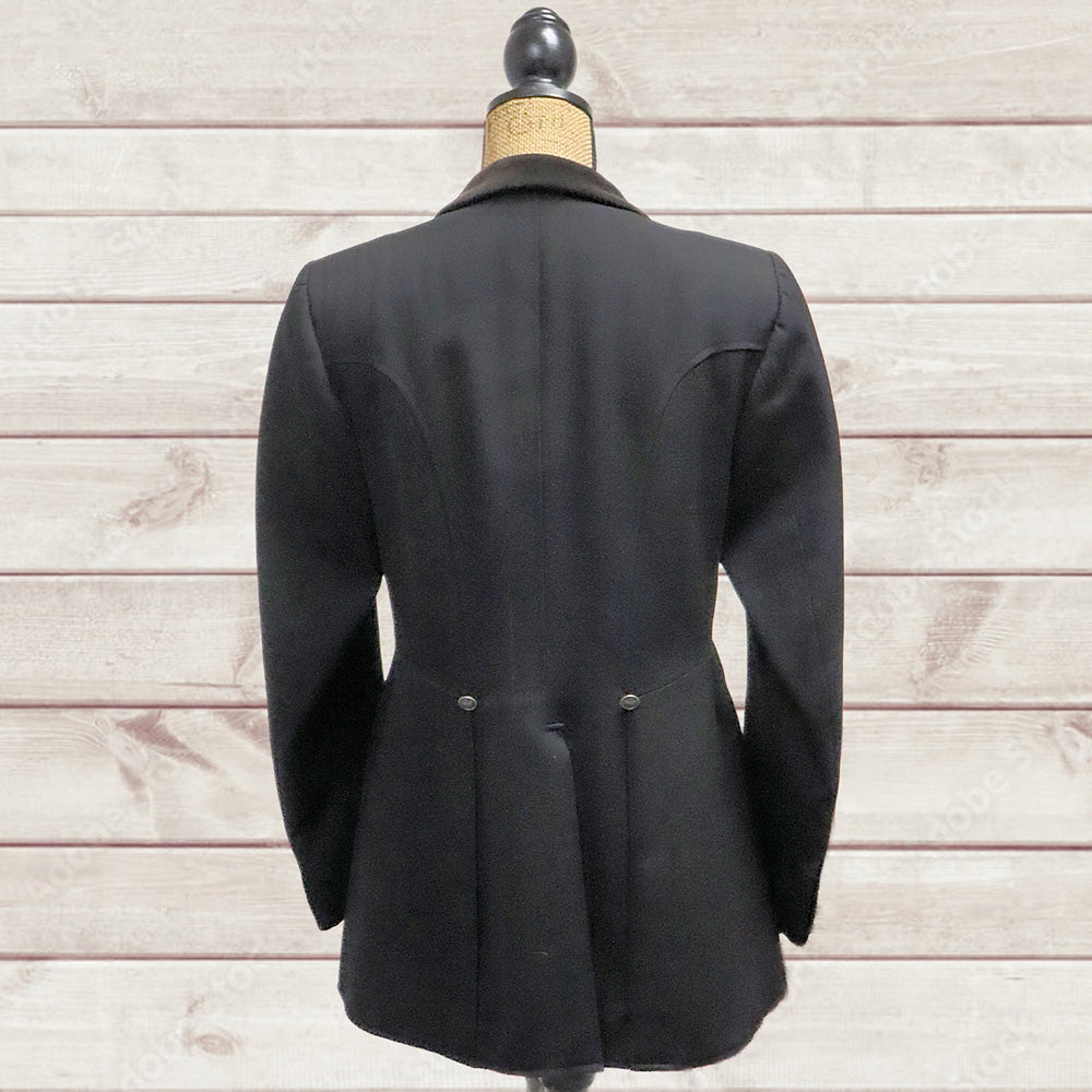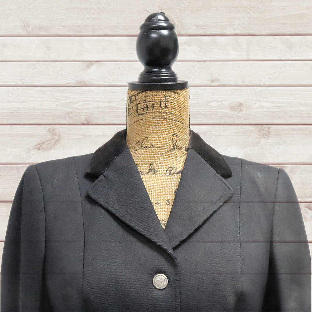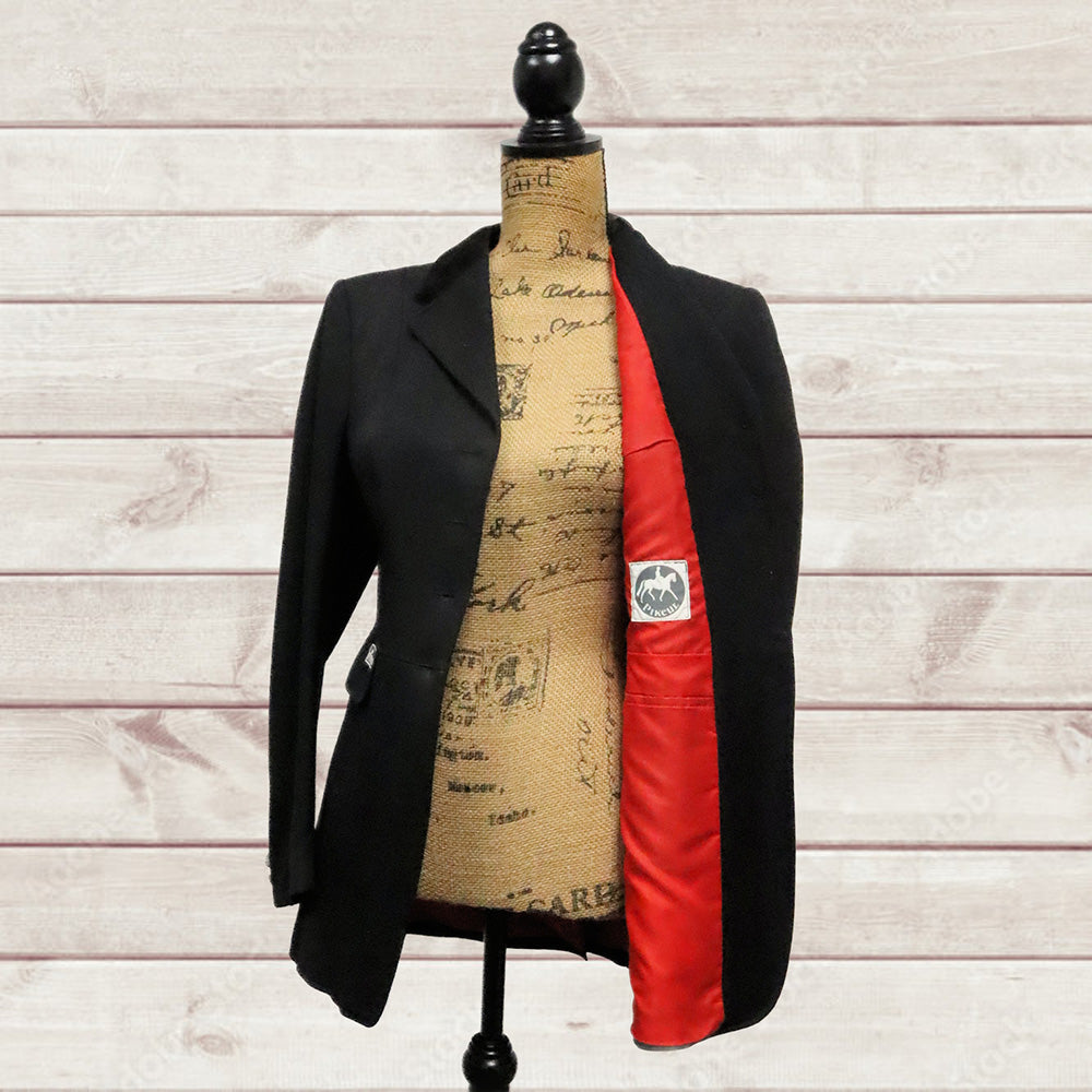 Dressage / Hunt Coat. Wool, winter weight. Black with Scarlet lining and Black Velvet Collar. Size 12.