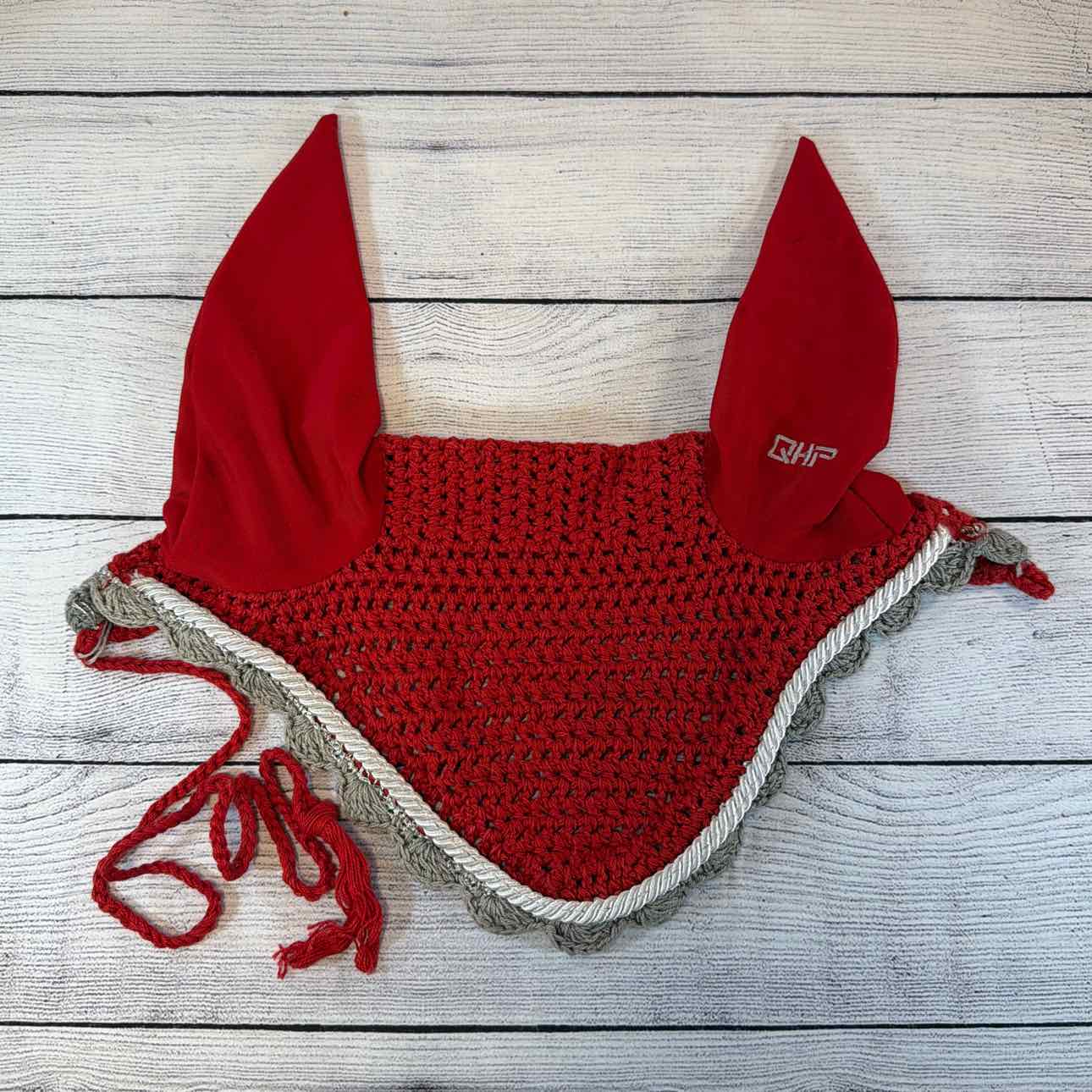 Crochet Ear Bonnet with Silver Scalloped Edge and White Corded Trim. Has Throat Latch Cord and Loop. QHP Embroidered on Left Ear. USED.