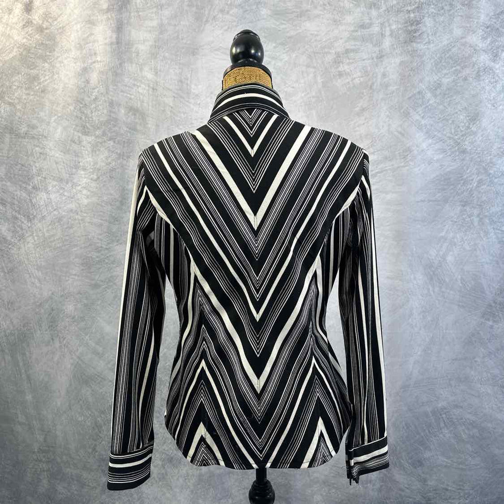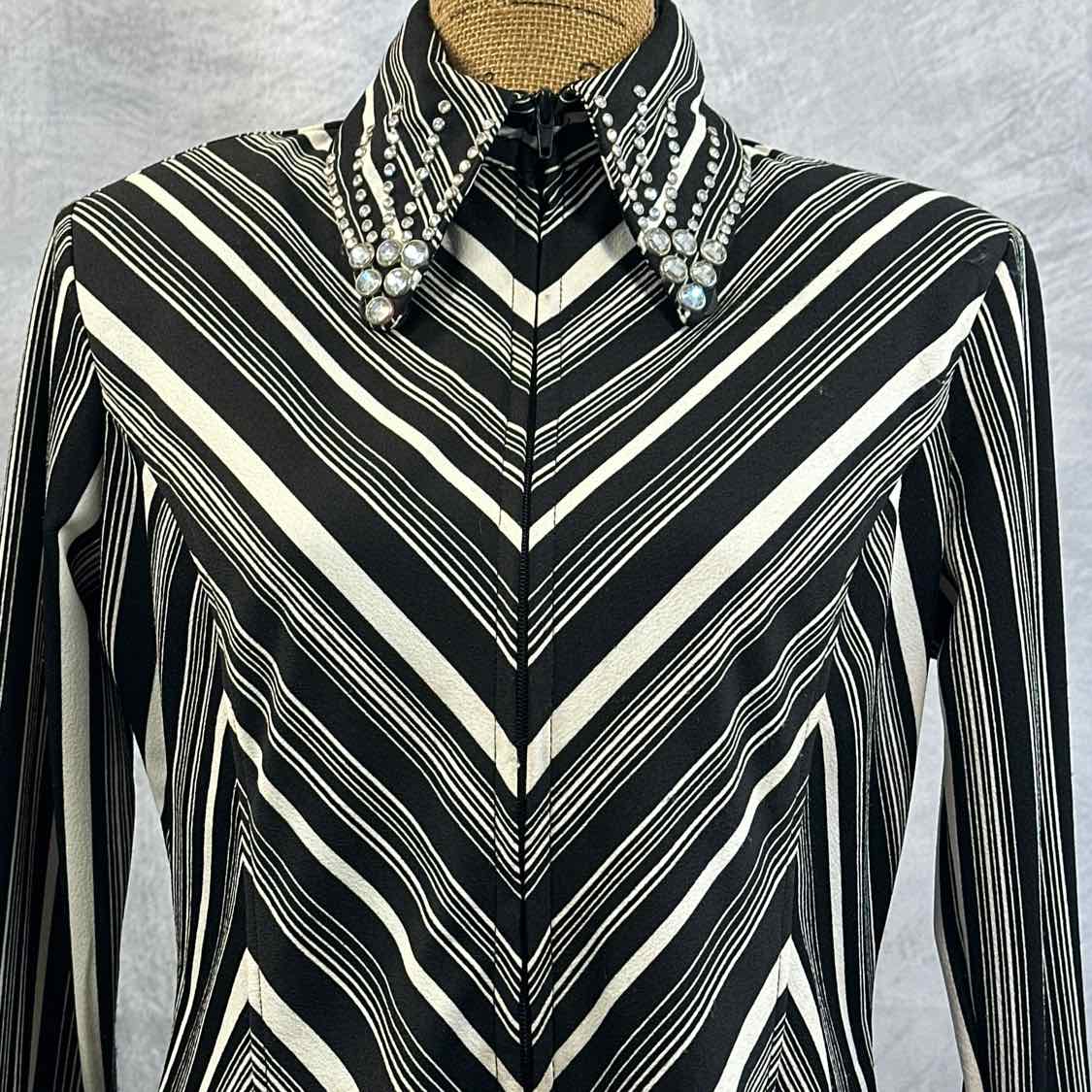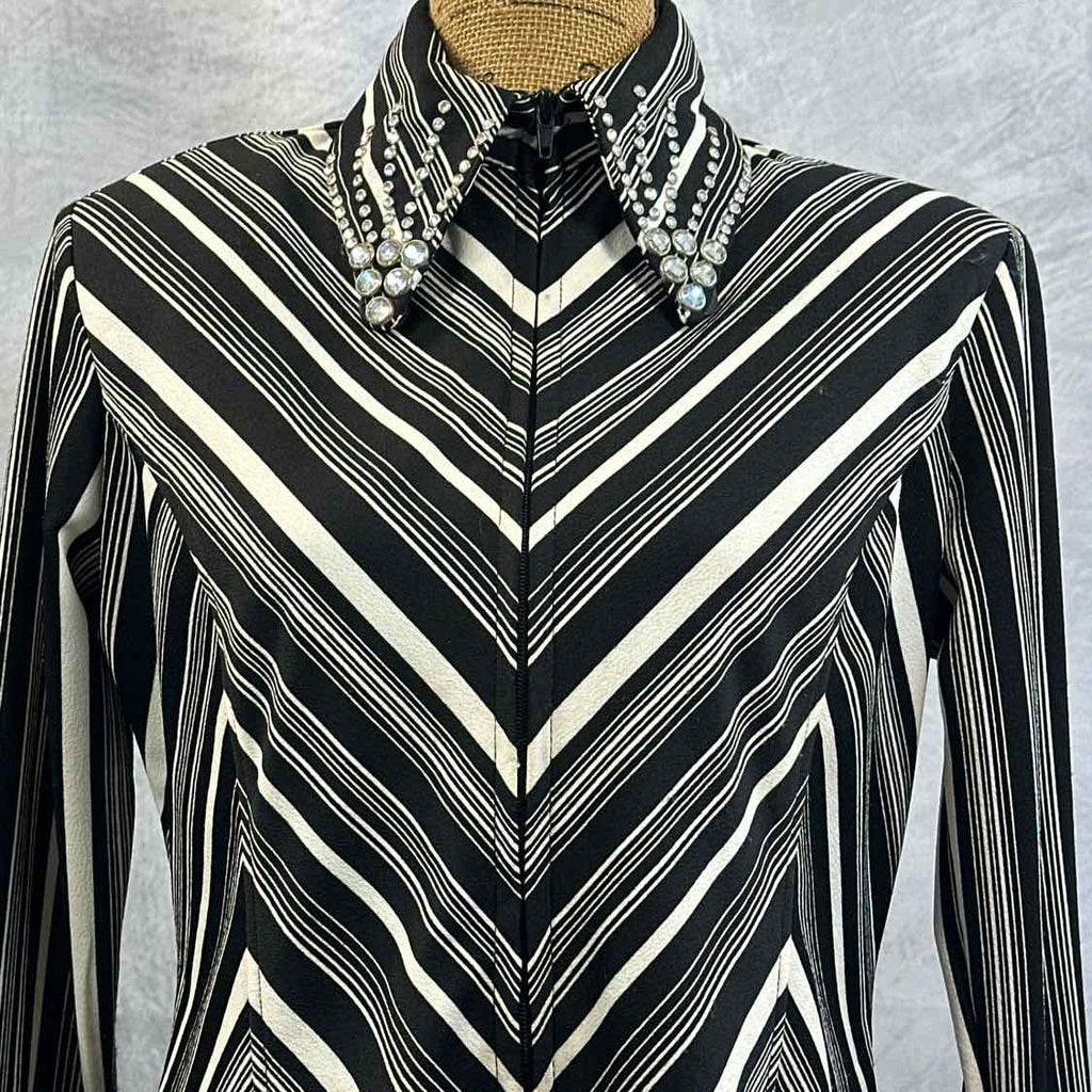 Custom Western Show Shirt. Black and White with Large Crystals on Collar. Excellent Condition. Full Front Zip and Zip on Cuffs. Has Shoulder Pads. Collar Held Down with Velcro Tabs.