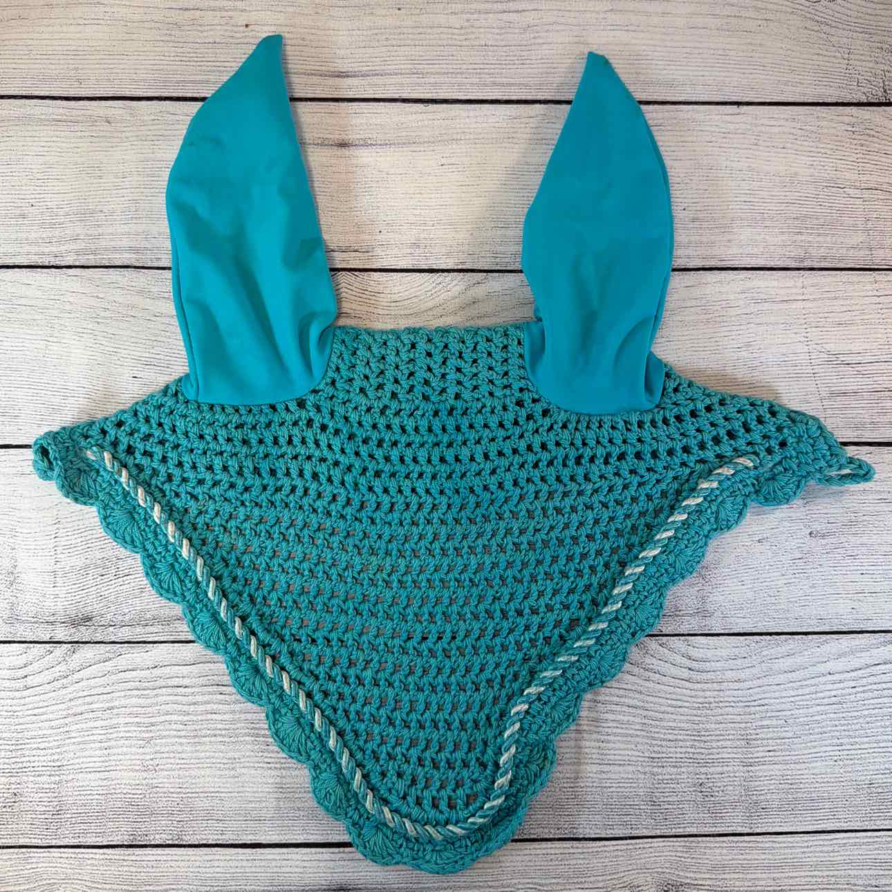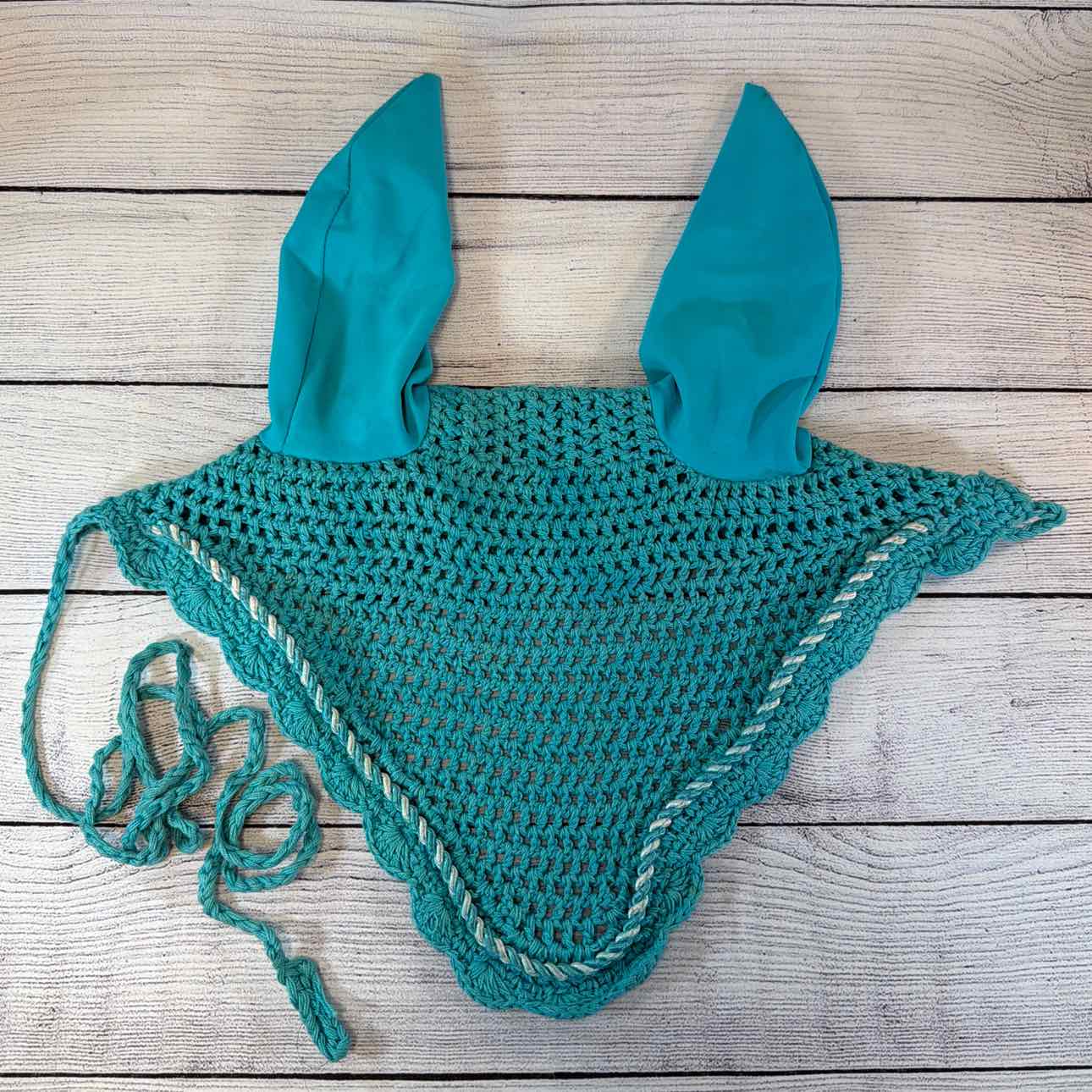 Crochet Ear Bonnet. Twisted Turquoise & White Corded Trim. Has Throat Latch Cord and Loop. USED.