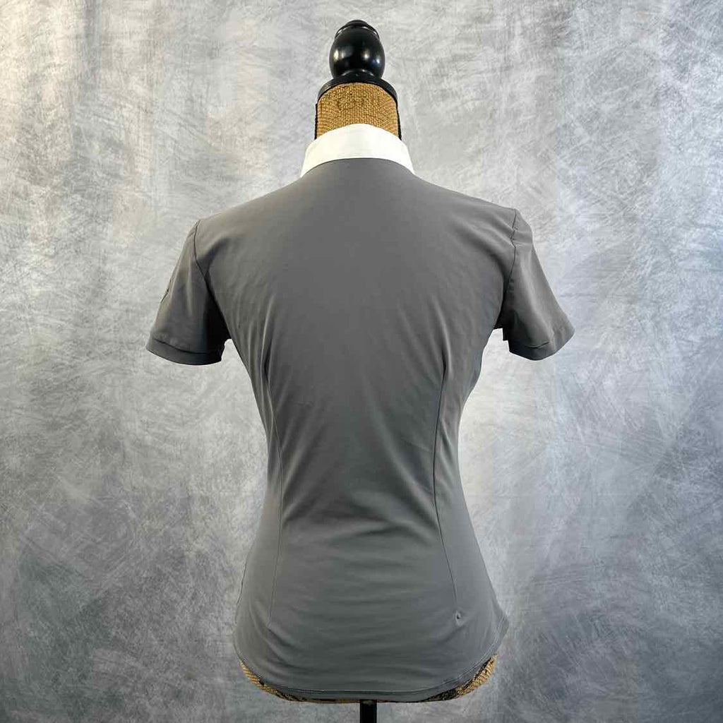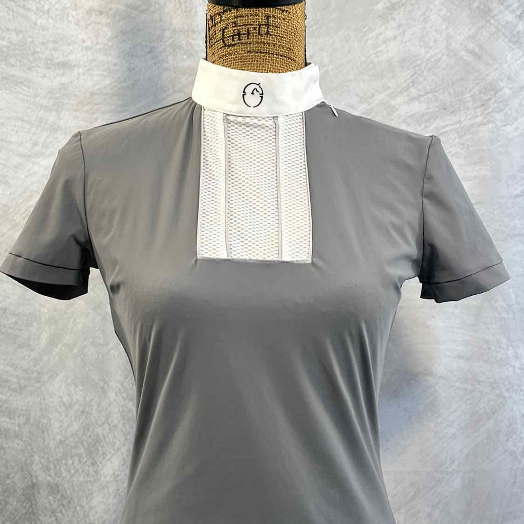 Short Sleeve Show Shirt. Grey and White. Hidden Snaps and Shoulder Zip. Designer Brand. Boutique. Stunning Shirt. Made in Italy.
